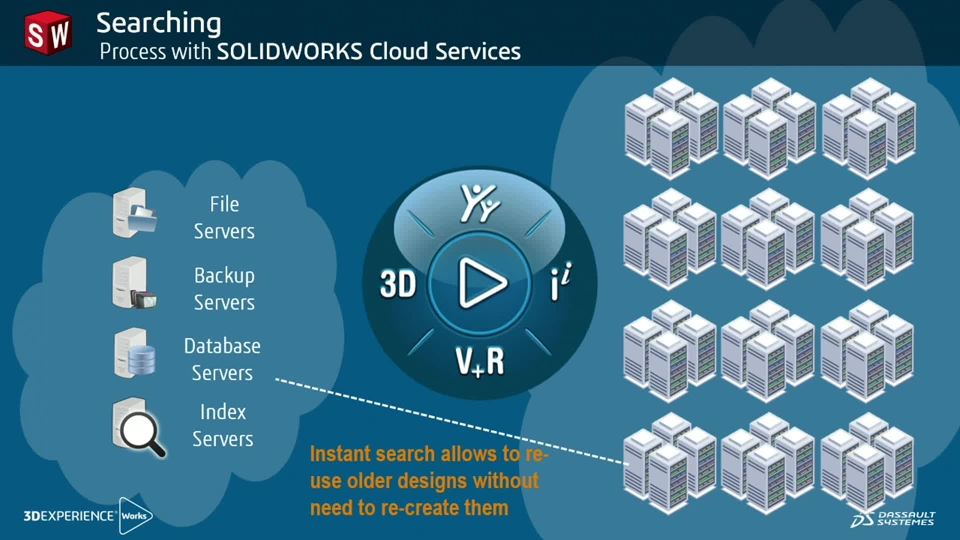 The enabling technology is called SOLIDWORKS Cloud Services and will greatly improve your life since it will remove all the headaches caused by managing files and struggling to secure your data. Some examples: stop losing your designs by accident, no more broken file references to fix, stop recreating designs that already exist thanks to powerful search, purpose built tools to track history of your modifications.