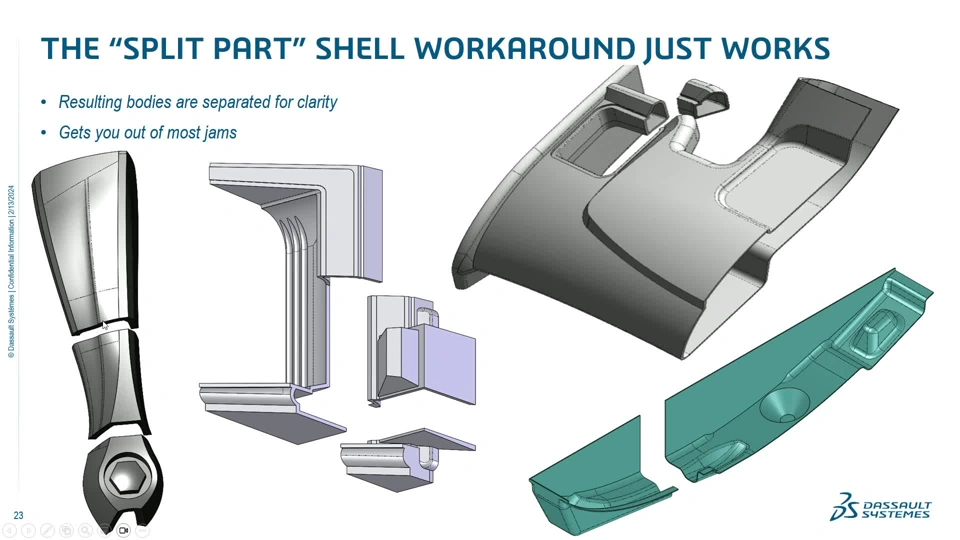 When the Shell feature works, it is amazing, and the background behind that will be discussed. And when it doesn’t work – that is when you need this session! We will cover why Shells fail, how to diagnose the source of the problem, and some simple (and sometimes devious) tricks to always make your part Shell. This session will also discuss how to beat the dreaded “vortex-vertex” problem, where the base geometry is great but the shelled side results in singularity geometry that can’t be tooled. The Shell feature is essential when making thin-walled molded and cast parts. Attendees will leave with a new perspective on and respect for how the Shell command works, and an arsenal of background –knowledge and tricks to make their parts Shell every time without compromising the manufactured article.