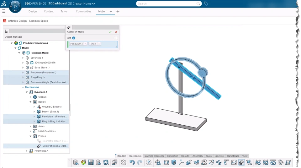 Benefit: Understand critical system conditions during simulation by defining the center of mass probes for a single body or a combination of bodies.