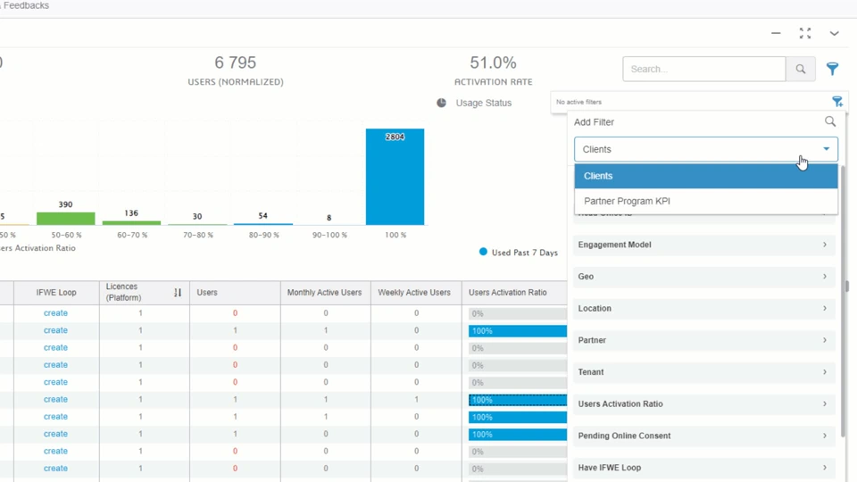 Open the "Cloud Usage" tab on your Cloud Adoption Dashboard and use the "CRE Activation Rate KPI" filter which allows you to restrict the list of lines (clients/license type) to the ones that participate in the KPIs calculation.