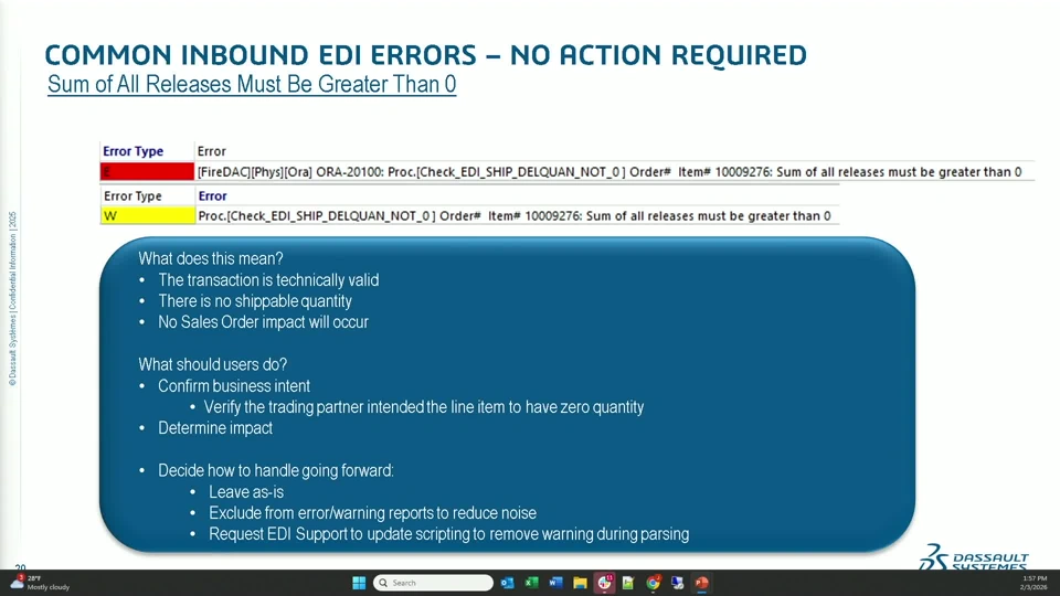Dive into an advanced troubleshooting session designed for experienced DELMIAWorks users managing inbound and outbound transactions. This session will walk through the most common setup and processing errors for customers and vendors, highlighting real world examples of how these issues impact day to day operations. Learn practical tips and tricks for diagnosing problems quickly, uncover hidden setup pitfalls, and explore strategies to prevent recurring errors. Attendees will leave with actionable insights to reduce support calls, streamline EDI workflows, and build confidence in resolving integration challenges.