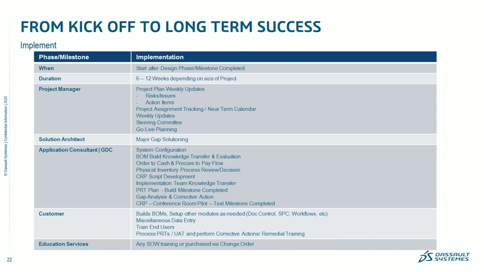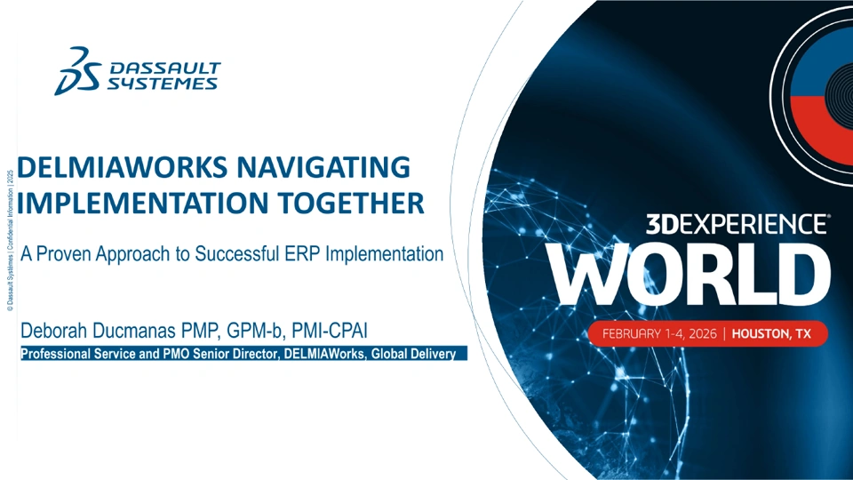 This session offers a structured, step-by-step framework for leading successful implementations from project initiation through sustained success. Attendees will gain practical insights into overcoming common challenges, streamlining processes, and maximizing the value of collaboration with professional services. This session demonstrates how partnering with our experienced DELMIAWorks team can drive measurable improvements across manufacturing operations. - Best for audiences focused on partnership and guidance - Emphasizes collaboration and the journey from kickoff to long-term success - Ideal for those who value structure, support, and shared problem-solving. Join us to explore a proven path to simplify implementation, overcome obstacles, and succeed long term.