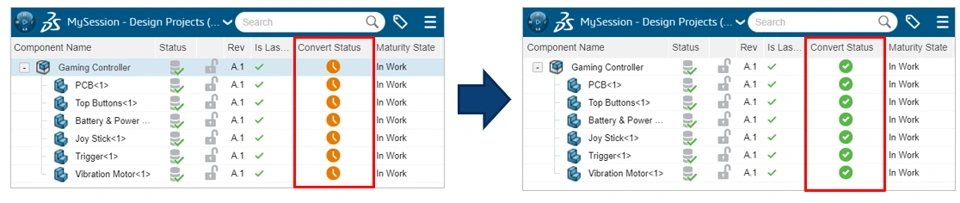 After saving to the 3DEXPERIENCE platform from SOLIDWORKS the convert status of each saved component will show an orange clock face symbol. As the ExactGeometry representation is generated asynchronously on the cloud the convert status column will automatically update to show a green circle with a white check mark.