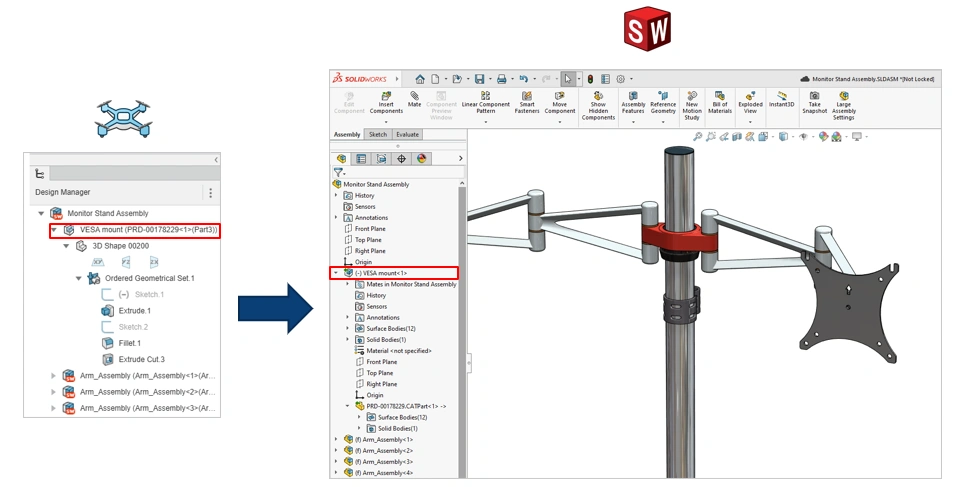 Even though designs created in both SOLIDWORKS and the cloud design apps are represented as physical products, due to the differences in architecture the parametric feature history will only be visible and editable in the respective authoring app.