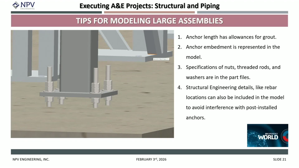 NPV Engineering, Inc. is a professional engineering design firm that uses SOLIDWORKS to execute traditional industrial-style projects. Our workflow allows us to fully model Structural, Mechanical, and Piping components to LOD 500. Our clients receive an LOD 500 3D model and a full BOM for the components installed. Some of our models have surpassed 100,000 piping parts. Clients have repeatedly executed projects with change orders of less than 1% during construction. Given Autodesk's prevalence in this space, we think it would be valuable for the SOLIDWORKS community to be aware of our workflow. We have proven that SOLIDWORKS can displace Autodesk in the AEC design industry.
