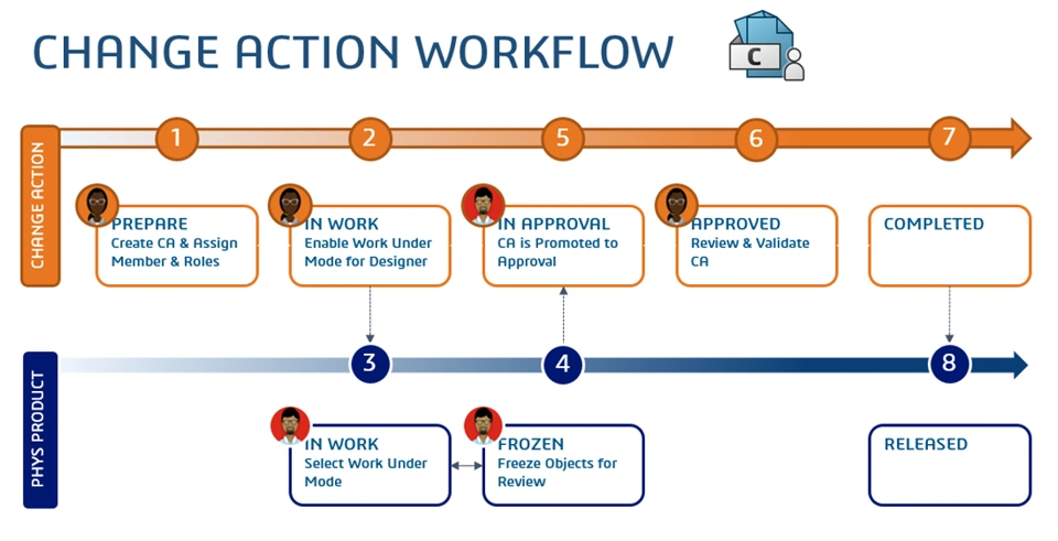 - A manager creates the change action item and assigns the members and defines their roles, and then adds the Physical Products required for the change plus any other supporting documents