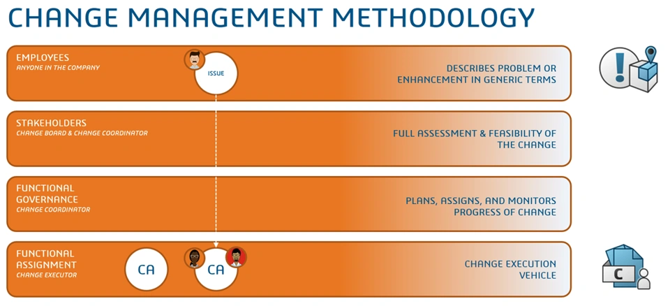 Using issues in combination with the Change Manager (CHG) role, issues can drive change orders, and a change order can drive multiple change actions. Issues can also govern a change request that in turn governs a series of change orders, and those change orders can drive multiple change actions.