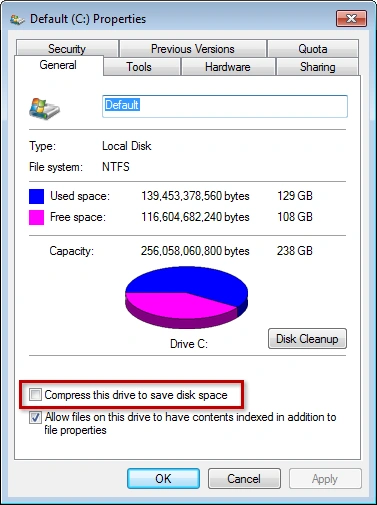 When running SQL Server, it is a strong recommendation that you do not select the Compress this drive to save disk space option under any circumstances.