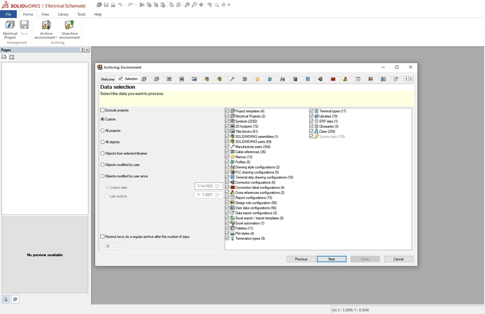 You can archive the SOLIDWORKS Electrical projects and environment by running the EwEnvironmentArchiver.exe file from SOLIDWORKS Electrical 2021 version onwards. The EwEnvironmentArchiver.exe file runs on Windows® 10 and Windows 11. You can schedule the archive process by using Windows Task Scheduler.