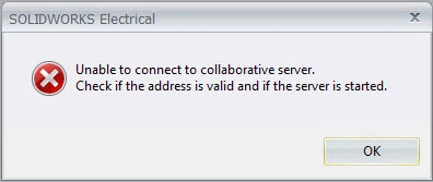 After starting the SOLIDWORKS Electrical software, if the error Cannot connect to Collaborative Server appears, it is because of one of the following reasons:
