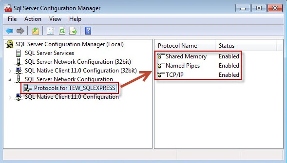 In the dialog box, select the server and make sure that the Shared Memory, Named Pipes and TCP/IP protocols have a status of Enabled. Also, make sure that you are selecting the SQL Server Network Configuration and not the 32-bit version.