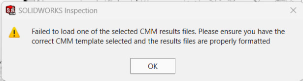 In order to read the CMM data, we first need a template (.xml) which can read the CMM data outputted from machine (like ‘Dukin.txt’ generated from Dukin’s CMM machine). If there is mis-match in the template that we are using and the CMM file that’s generated, it will give us and error 'Failed to load one of the selected CMM results files. Please…..'.