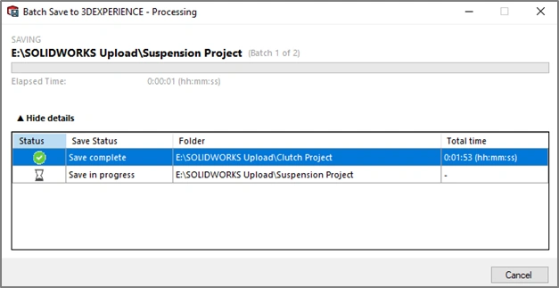 The Batch Save utility is suited to large datasets that contain multiple projects with a datasize <5GB. Once a Batch Save is underway, the tool will run asynchronously in the background enabling the user to continue working in their SOLIDWORKS session.