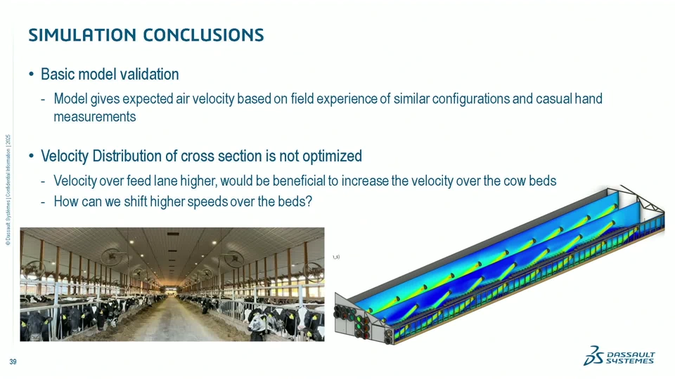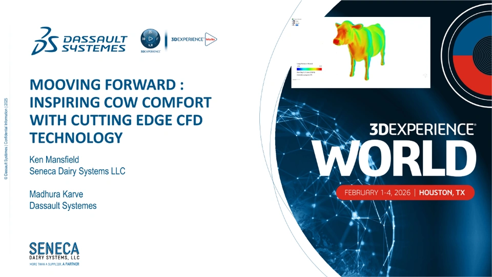 Have you ever seen a cow with sunglasses chilling at the beach? Probably not, but you’ll be sure to see them chilling in a barn designed by Seneca Dairy Systems. These barns are equipped with a well-designed ventilation system that uses cutting-edge Computational Fluid Dynamics (CFD) Technology on the 3DEXPERIENCE platform. This session will demonstrate the simplicity of building designs in SOLIDWORKS and transitioning to a Fluid Dynamics Engineer role to optimize parameters such as the number of fans and fan speed. The key benefit of this approach is the ease with which it enables mass customization of ventilation designs for Seneca’s customers. After all, ensuring cow comfort will guarantee increased milk production and more comfortable cows. So, join us in this interesting, very innovative CFD implementation to keep our cows cool and happy.