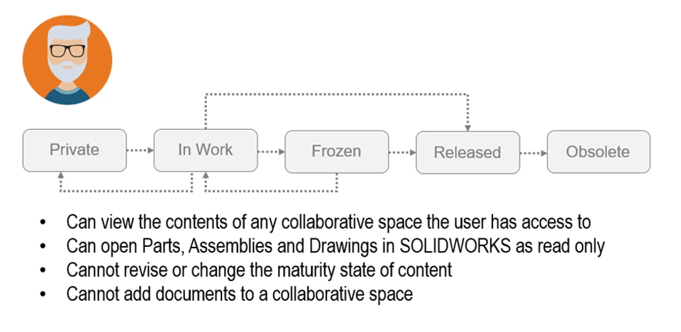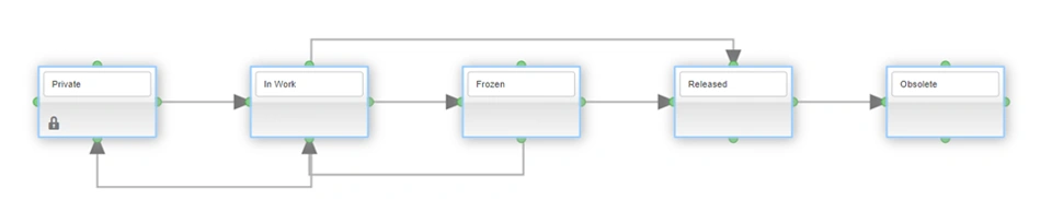 3DEXPERIENCE provides clients with a preconfigured lifecycle for SOLIDWORKS parts, assemblies and drawings, consisting of five states. This is called the Engineering Definition Maturity Graph.