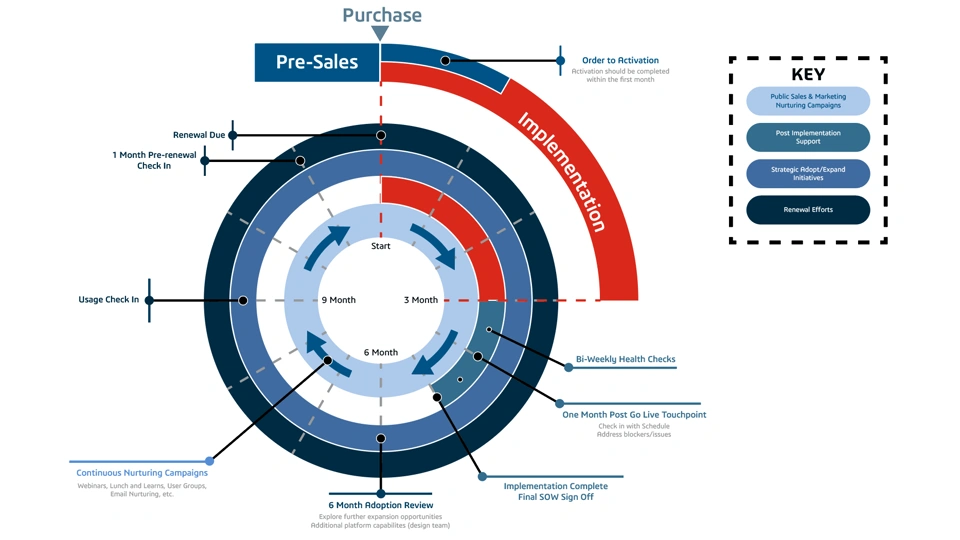 See below for an example roadmap illustrating the engagements you might have with a medium touch customer. Remember, this is just an example and should always be modified to suit both your customers needs and your internal strategies. Other reasons for meeting/types of engagement are displayed in the second image.