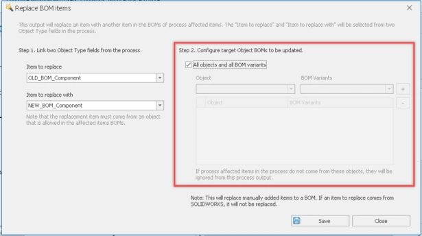 - If you select the "All Objects and All BOM Variants" option, all BOMs will be updated. However, if the "Item to Replace With" is not permitted in a specific BOM, it will not be replaced, and the user will be notified of the reason.