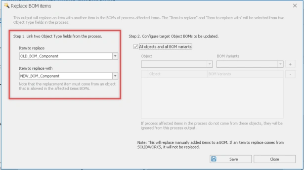 STEP 1. Link two Object Type fields from the process. Navigate to Workflow Properties > Choose the desired stage > Access the Outputs section > Set the type to Replace BOM items.