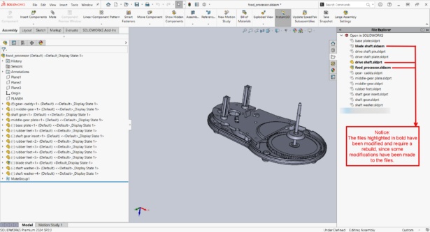 - Rebuilding (Ctrl + Q) or force rebuilding (Ctrl + Shift + Q) in SOLIDWORKS initiates updates across the entire assembly.