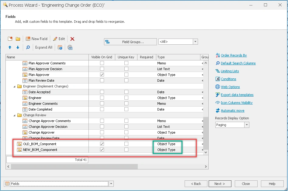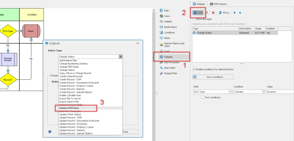 Each workflow stage can have multiple automated outputs, which can perform various actions such as creating new records, updating existing ones, changing PDM states, adding related files, exporting files, and more. The ‘Replace BOM Items’ output is one of these actions. It allows you to replace an item with another in the Bill of Materials of the affected process items. However, it only replaces manually added BOM items and does not affect items added through SOLIDWORKS, for example.This process output requires the configuration of two Object Type fields within the process itself. If these fields have not yet been created, you’ll need to close the configuration page and set them up before proceeding.
