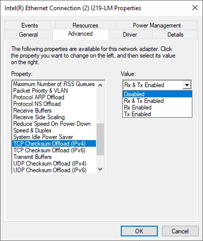 For most common network traffic, offloading checksum calculations to the network adapter hardware offers a significant performance advantage by reducing the number of CPU cycles required per byte. However, it is possible that offloading checksum calculations to the network adapter can cause severe slowness when working with the SOLIDWORKS PDM Add-in.