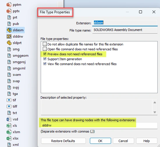 It is also possible to improve performance when previewing SOLIDWORKS assembly or drawing files by activating the Preview does not need referenced files option in the File Type Properties dialog box. This prevents SOLIDWORKS PDM from caching referenced files when previewing assembly or drawing files in the eDrawings window.