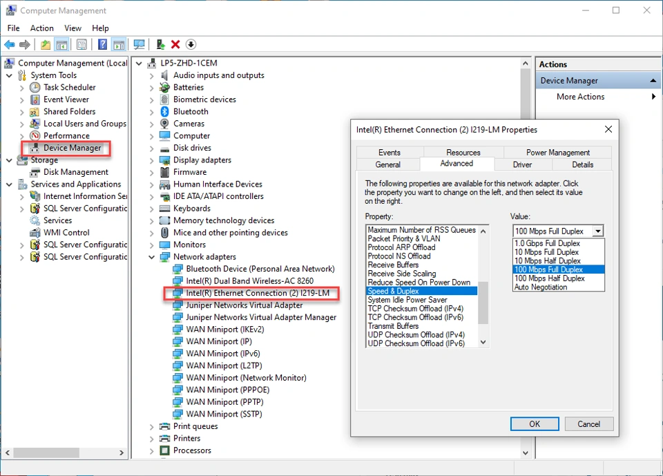 - In the Device Manager section of the Windows Computer Management console, specify 100 Mbps Full Duplex as the network adapter duplex speed for Computer A as shown in the following image: