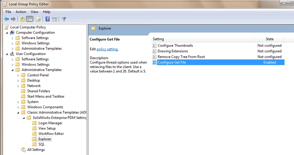 If you experience slow operations when caching large assembly or drawing structure files in a vault view, it is possible to configure the SOLIDWORKS PDM Explorer Get File group policy to use fewer threads.