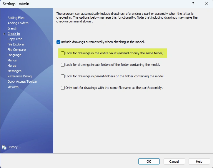 For check-in operations, turning off the Include drawings automatically when checking in the model option can reduce the amount of time it takes to display the Check In dialog box, because the database query does not have to include all the drawings. Deactivating the Look for drawings in the entire vault option lists only drawings that exist in the same folder.