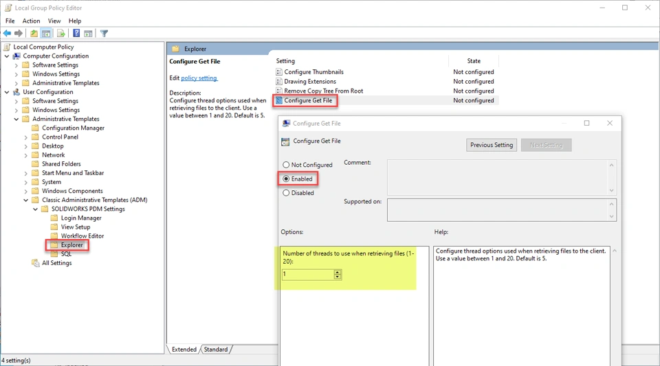You can apply this group policy client setting to SOLIDWORKS PDM clients in both replicated and non-replicated environments. If in a replicated environment, be aware that this setting does not effect on-demand replication, which is a single-thread operation by design.