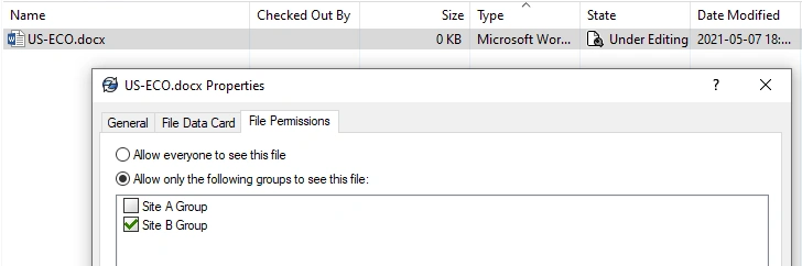 For example, the following image depicts a case where the UK Site A Group can read file contents, add or rename a file or add or rename a folder for Project UK.