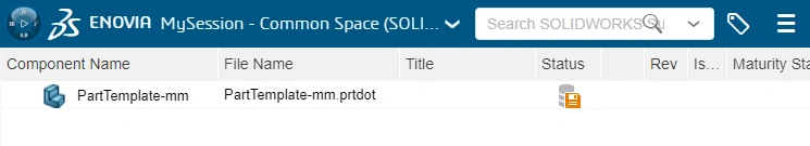 You can use the Save commands available in the MySession widget to save a SOLIDWORKS template file to the 3DEXPERIENCE platform. These include the right-click > Save, right-click > Save with Options and Save Active Window commands.