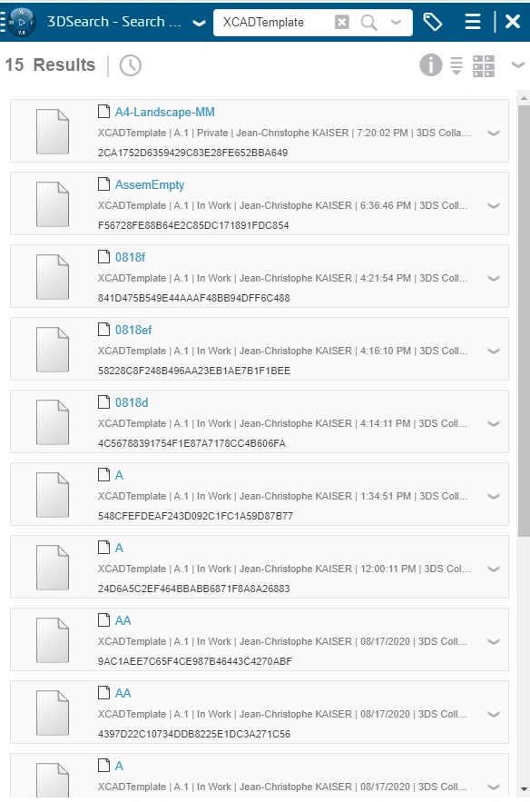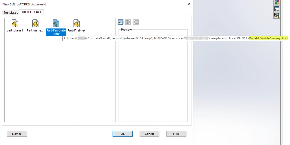 Title is a 3DEXPERIENCE attribute. Template titles do not affect file names of the target objects (part, assembly or drawing). Modifying an existing template title, as described in section b), also does not affect its file name. Templates appear with the titles in the