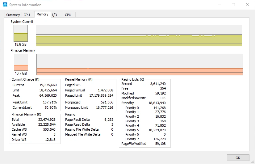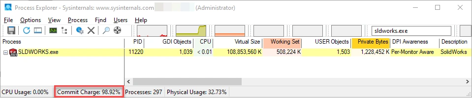 Here is another example from the same system. In this example, the performance of the SOLIDWORKS application or any other Windows application is a concern because Commit Charge is near 100%.