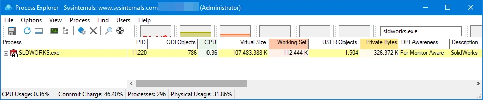 When investigating issues live on a computer, use the Process Explorer utility to validate low resource situations. This is a great resource to review system level and application resource usage in one place. The critical resources for optimal performance and stability with SOLIDWORKS are memory and desktop objects. This includes GDI and User objects.