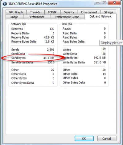 Accessed the application properties, by right-clicking on the 3DEXPERIENCE.exe process > Properties> Disk and Network.