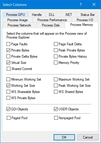 The top pane displays all of the running applications. It includes customizable columns that allow you to track many different system resources. The following example depicts many items that relate to Process Memory.