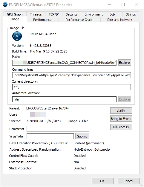 The previous image shows the Image tab for ENOPLMCSAClient.exe. ENOPLMCSAClient.exe also known as the, PLM Collaborative Services Adapter (PLMCSA), client is a helper process that connects SOLIDWORKS to the 3DEXPERIENCE Platform for the Design with SOLIDWORKS and SOLIDWORKS Connected 3DEXPERIENCE Applications. You may see details such as: