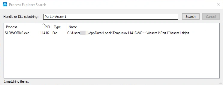 The search returns one matching item. You can see that the file actually loads in a temporary file location. Clicking on the item in Process Explorer highlights the process and location of the file handle in the lower pane.