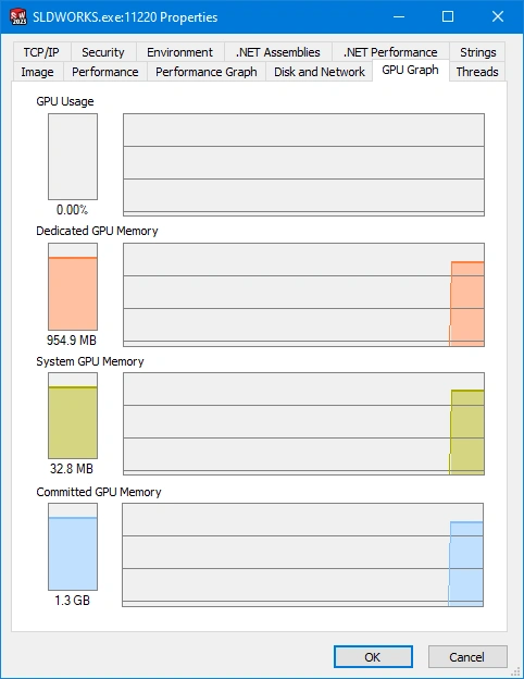 This metric is very useful to help understand if users running the SOLIDWORKS application are maxing out on the amount of dedicated Video Card Memory on their systems. To view the GPU memory usage: