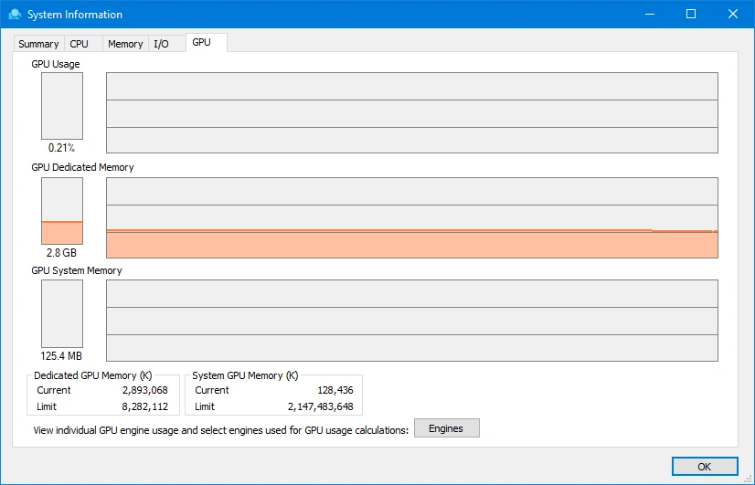 In the previous image depicts an 8 GB graphics card that is consuming 2.8 GB of dedicated Video Random Access Memory (VRAM). Adding and sorting the GPU counters in the Process Explorer top pane displays the processes that contribute to the dedicated VRAM.