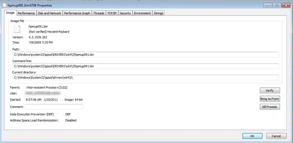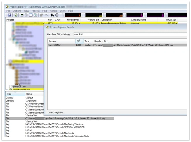 The search results revealed that the Hpmup091.bin file was holding on to the swxJRNL.swj file. Clicking on the process name highlighted the process in the process tree list. From here, the TSE was able to analyze the properties of hpmup091.bin. Refer to the next image.