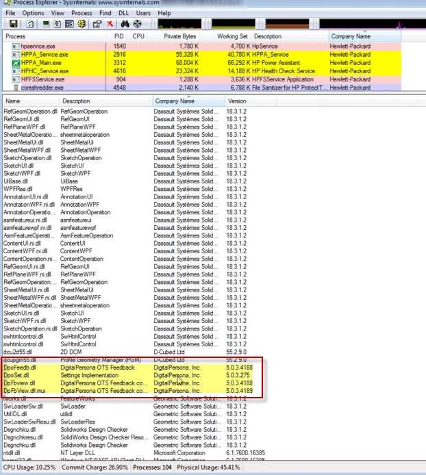 In the previous image, a sort by Company Name displays a collection of DigitalPersona® DLL’s within the SLDWORKS.exe process. Because this issue was only repeatable in the user’s environment, the next step was an attempt to keep these third-party DLL’s from loading into the SOLIDWORKS software. A quick investigation using Google™ search and a review of the location of these DLL’s established that the following executable files were responsible for the behavior.