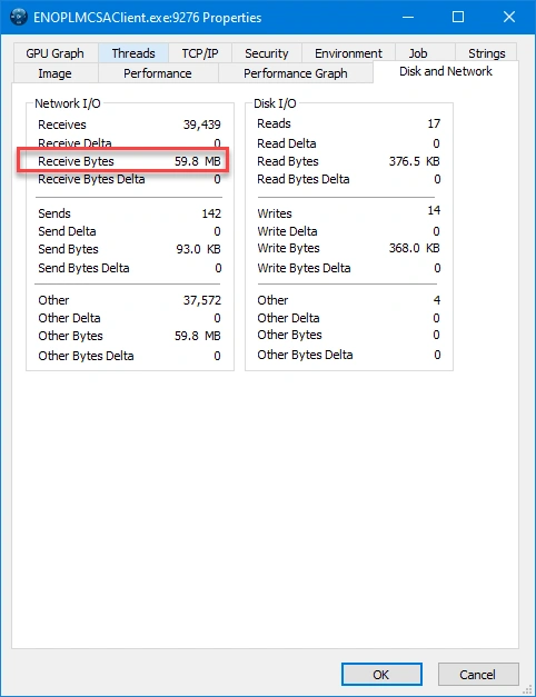 Accessed the application properties, by right-clicking on the ENOPLMCSAClient.exe process > Properties> Disk and Network.