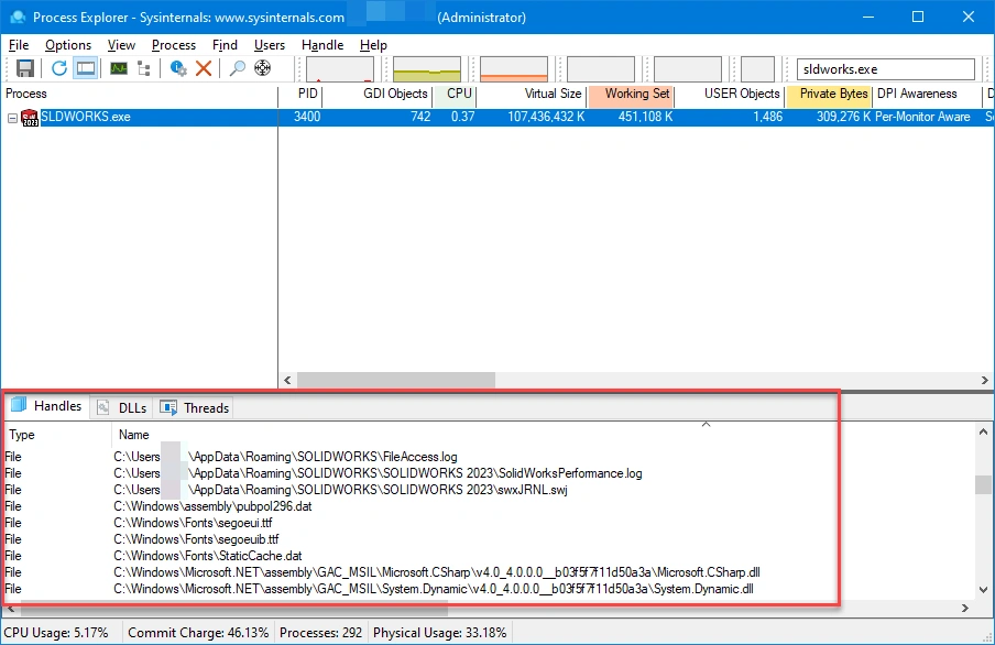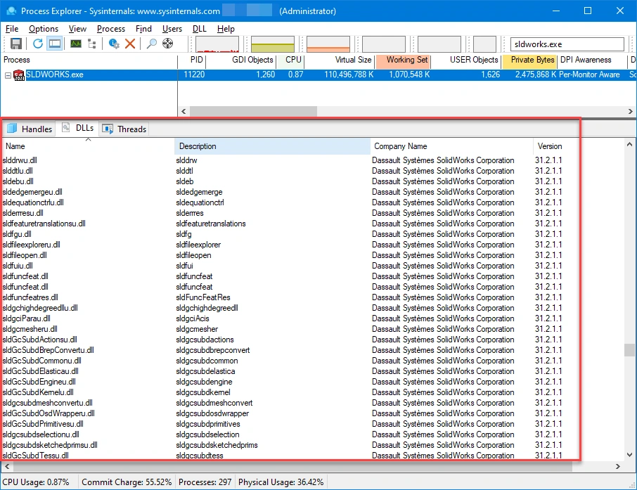 DLL’s that load within the SLDWORKS.exe process appear in the lower pane.
