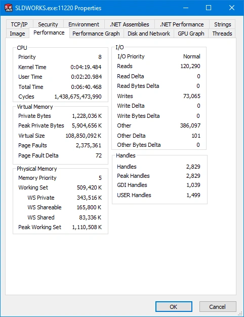In the process tree, right-click on SLDWORKS.exe > click on Properties > and then click on the Performance tab.