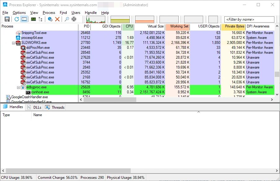 Think of Process Explorer as a more advanced Windows Task Manager. There is a lot of information that is relevant to common SOLIDWORKS troubleshooting scenarios that involve file management, system resources, anti-virus, and security. Here is a list of the type of information available within this utility.