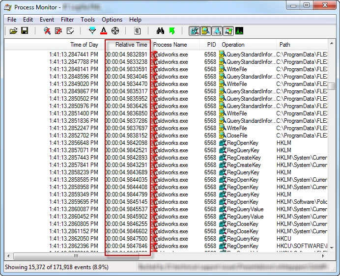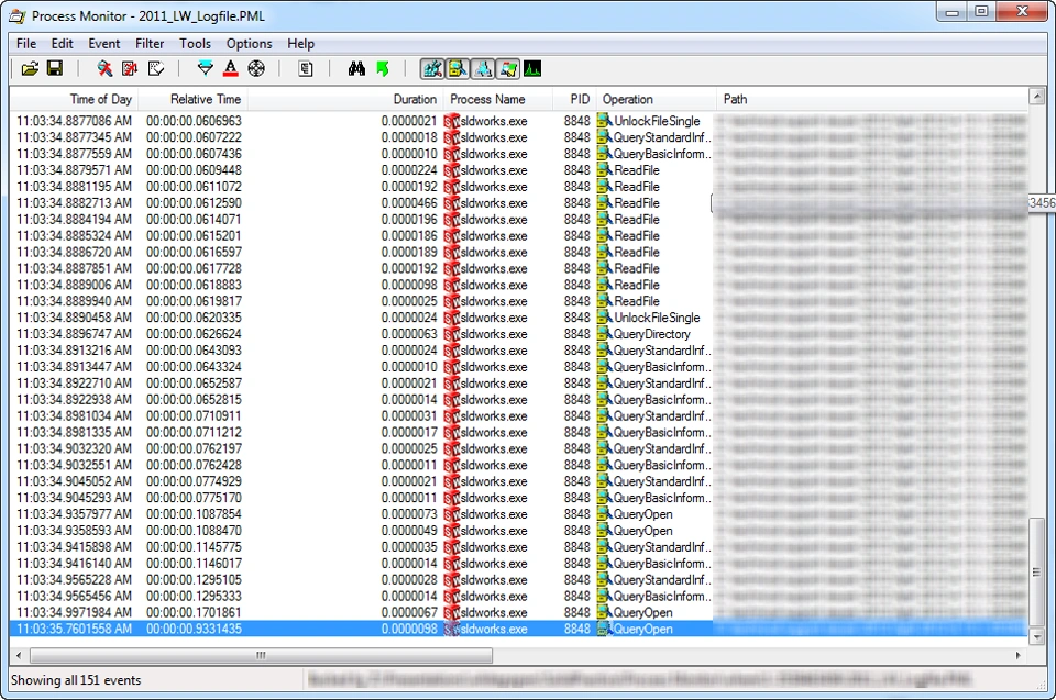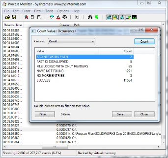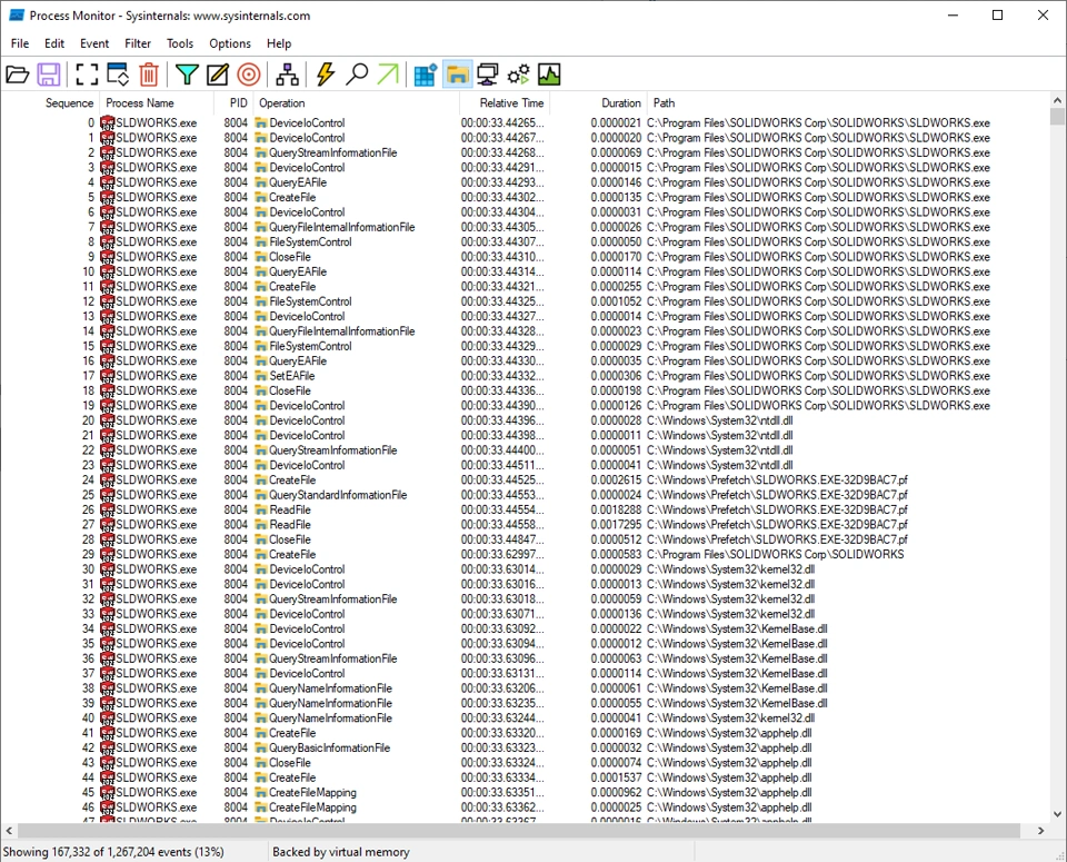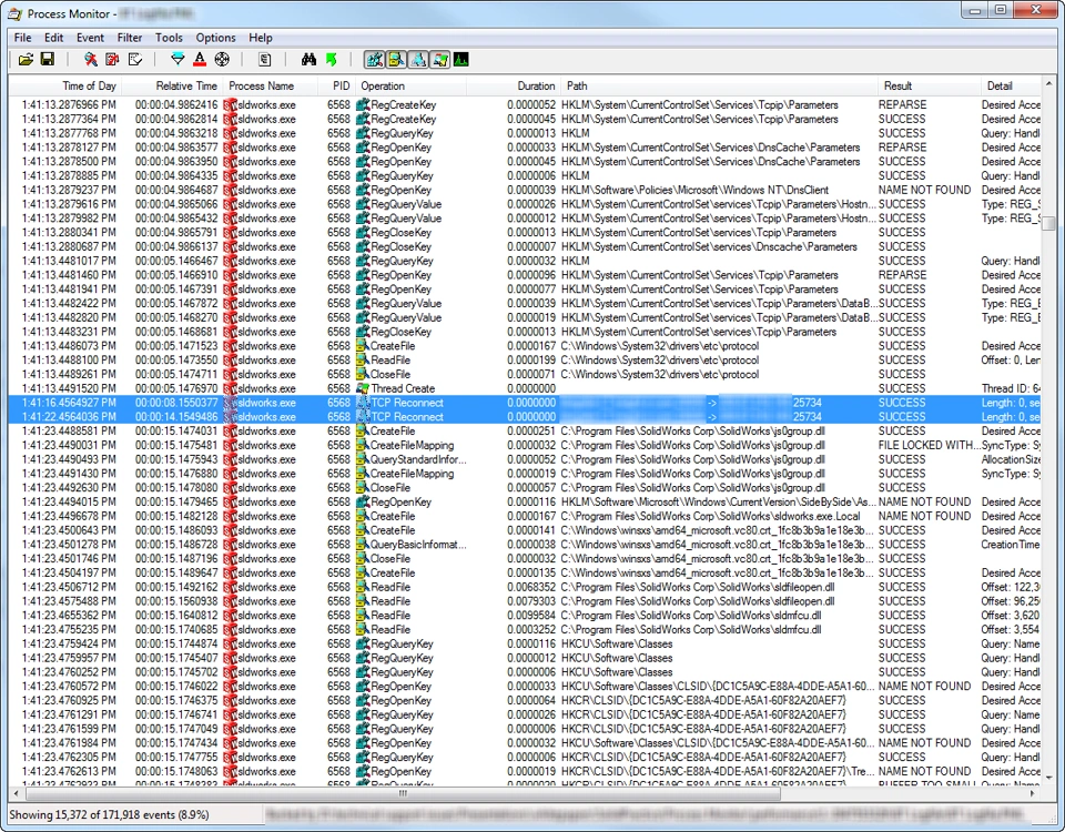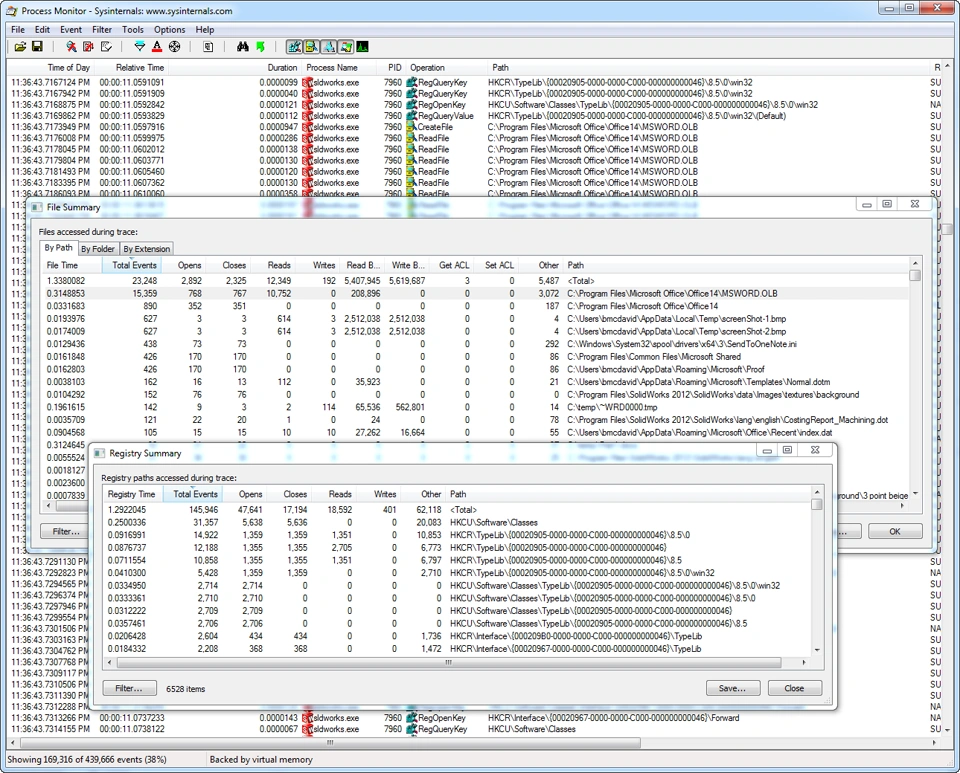 Process Monitor has the capability to provide a behind the scenes look at system activity. For example, it is possible to review file activity, Windows Registry activity, and network operations from SOLIDWORKS.