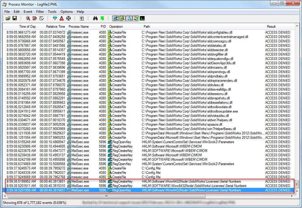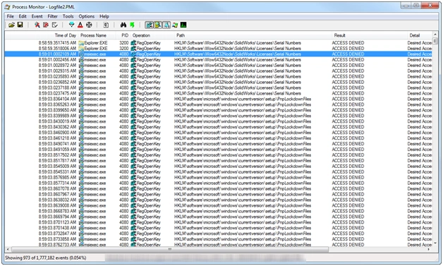 There are many events with a result of ACCESS DENIED. We shall ignore the file events and focus on the registry events. According to the “1406” error message, the issue relates to SOLIDWORKS registry keys. Based on this, focus on the registry keys within the red rectangle as possible culprits.