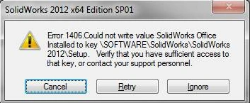 “Error 1406. Could not write value SOLIDWORKS Office Installed to key \\SOFTWARE\\SOLIDWORKS\\SOLIDWORKS 2012\\Setup. Verify that you have sufficient access to that key, or contact your support personnel.”